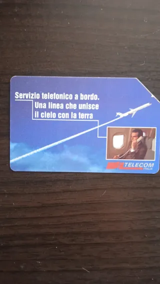 Carta telefonica Telecom Italia con grafica a tema aereo. - Servizio telefonico a bordo. - Una linea che unisce il cielo con la terra. - Immagine di un aereo e di un uomo al telefono in cabina.