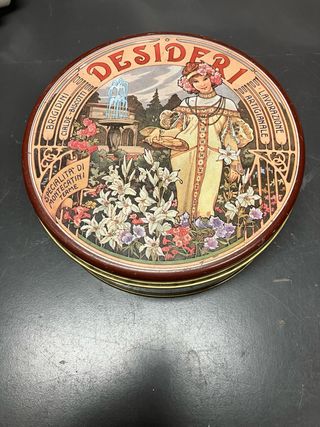 Elegante scatola di latta vintage con decorazioni floreali e una figura femminile in stile Art Nouveau. Presenta il marchio Desideri e Montecatini Terme. - Scatola rotonda in latta. - Illustrazione con fiori, fontana e architettura. - Scritta Desideri in alto. - Dettagli Brigidini Cialde-Biscotti Specialità di Montecatini Terme e Lavorazione Artigianale sui bordi. Misure esterne 18x6,5 misure interne 17,5x5,5