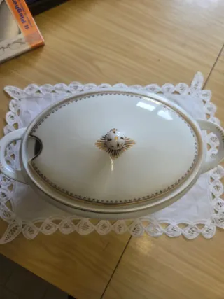d'epoca in pregiata porcellana bianca austriaca, prodotta dalla manifattura Moritz Zdekauer (MZ) ad Altrohlau. Modello: "Modern" Epoca: Inizio '900 (Periodo ArtNouveau / Liberty). Dettagli: Decori geometrici e bordi rifiniti in oro zecchino. Presenta il marchio autentico con il trifoglio verde sul fondo ("MZ Austria").Dimensioni: larghezza da manico a manico, 37 cm Stato: Ottime condizioni generali per l'epoca. Segnalo lievi e normali segni del tempo sulla base d'appoggio (come da foto), che non necompromettono l'estetica. Perfetta per una tavola raffinata o come pezzo da collezione.