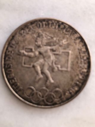 Moneda commemorativa dei Giochi Olimpici del Messico 1968. - Design con figura pre-ispanica. - Simbolo degli anelli olimpici.