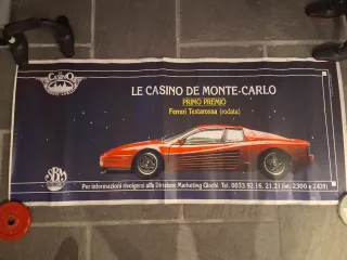 Poster promozionale del Le Casino de Monte-Carlo con la Ferrari Testarossa come primo premio. - Raffigura una Ferrari Testarossa. - Titolo LE CASINO DE MONTE-CARLO. - Indica PRIMO PREMIO Ferrari Testarossa (rodata). - Contiene informazioni di contatto per Direzione Marketing Giochi.