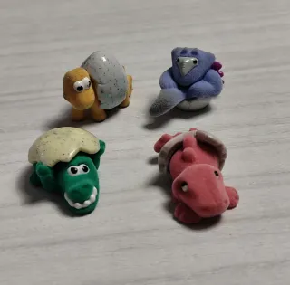 Set di 4 simpatici dinosauri in gomma floccata, provenienti dalle sorprese Kinder del 2008. Vendo anche singolarmente. - Dinosauri in gomma floccata. - Collezione Kinder Sorpresa 2008. - Include 4 pezzi.