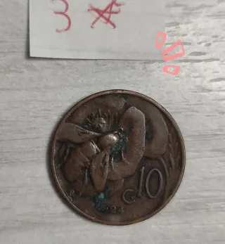Moneta da 10 centesimi di Lire Italiane. - Anno di conio: 1924 - Dritto: Ape e fiore - Rovescio: Valore nominale 10 e C - Metallo: rame.