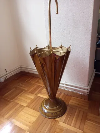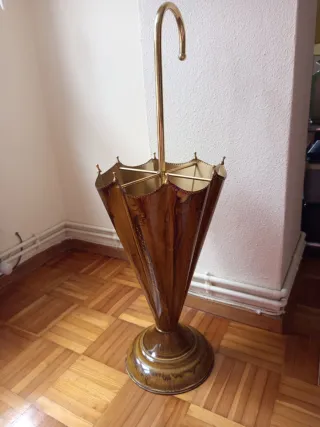 Portaombrelli elegante con design conico e base circolare. Materiale: Ottone. Finitura lucida. Dettagli dorati sul bordo superiore.