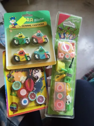 Set di gomme da cancellare a tema. - Gomme a forma di macchine da corsa con nomi di marche. - Gomme a forma di frutta e altri disegni. - Include un piccolo set di cancelleria con portachiavi a forma di sushi e trapano.