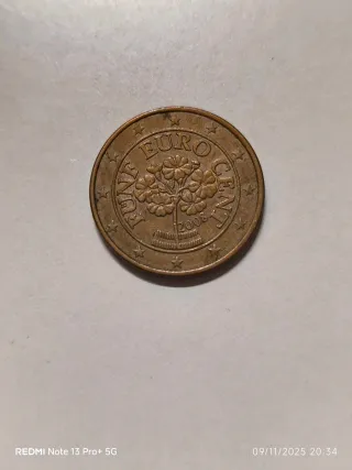 Moneta da 5 centesimi di euro, coniata in Austria nel 2008. Raffigura un ramo con fiori. - Valore nominale: 5 centesimi di euro. - Paese di emissione: Austria. - Anno di coniazione: 2008.