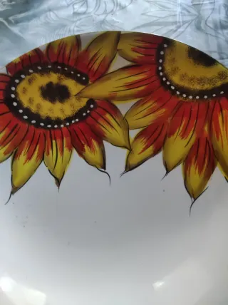 Elegante piatto piano di grandi dimensioni, perfetto per arricchire la tavola. - Decorazione dipinta a mano con vivaci girasoli. - Colori caldi e accesi. - Bordo rifinito con cura.