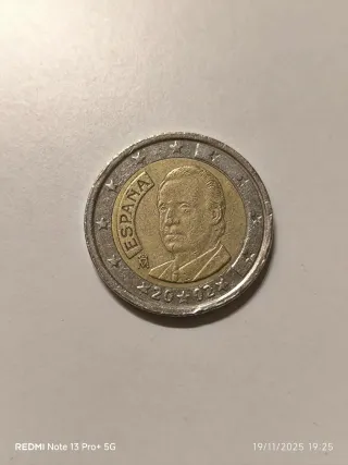 Moneta da 2 Euro della Spagna, coniata nel 2002. - Dritto: Ritratto di Re Juan Carlos I. - Rovescio: Mappa dell'Unione Europea. - Anno di coniazione: 2002.