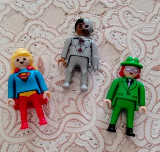 Set composto da tre personaggi Playmobil a tema supereroi. - Personaggio Supergirl con mantello rosso. - Personaggio Cyborg con dettagli metallici. - Personaggio Enigmista con abito verde e cappello.