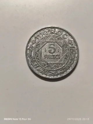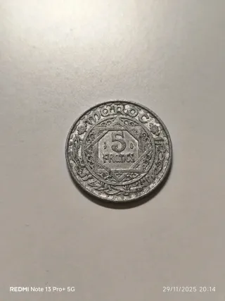 Moneta da 5 Franchi del Marocco, coniata nel 1951. - Dettaglio del valore 5 FRANCHI al centro. - Bordi decorati con motivi geometrici e vegetali. - Scritta MAROC lungo il bordo superiore.