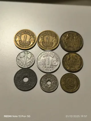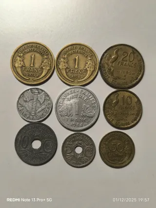 Lotto composto da 9 monete antiche della Francia. - Monete con valore di 1 Franco, 10 Franchi, 20 Franchi, 50 Centimes. - Anni di conio visibili: 1937, 1938, 1941, 1944, 1952. - Dettagli raffiguranti Marianne, gallo, fascio littorio e corona d'alloro.