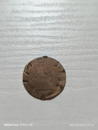 Moneta da 2 centesimi del Regno di Spagna, coniata nel 1870 governo provvisorio - Dritto: Leone rampante con scudo. - Rovescio: Corona reale e iscrizione. - Anno: 1870. - Zecca: cc (probabilmente Siviglia). - Valore: 2 Centesimi.