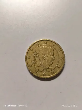 Moneta da 50 centesimi di euro del Belgio, coniata nel 2014. - Dritto: Ritratto del Re Alberto II. - Rovescio: Mappa dell'Europa con il valore nominale.