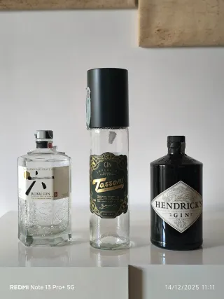 Vendo 3 bottiglie vuote di gin, perfette per collezionisti o per riutilizzarle in modo creativo. - Bottiglia di Roku Gin, Japanese Craft Gin. - Bottiglia di Tassoni Gin, Superfine. - Bottiglia di Hendrick's Gin.