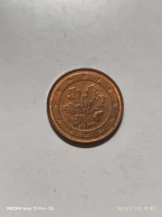 Moneta da 5 centesimi di Euro, coniata in Germania nell'anno 2022. - Dritto: Foglia di quercia. - Rovescio: Valore nominale e confini dell'Europa. - Anno: 2022. - Zecca: G (Karlsruhe).