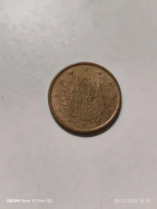 Moneta da 5 centesimi di Euro, coniata in Spagna nel 2017. - Dritto: raffigura la Cattedrale di Santiago de Compostela. - Rovescio: valore nominale, mappa dell'Europa e 12 stelle.