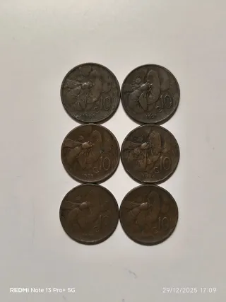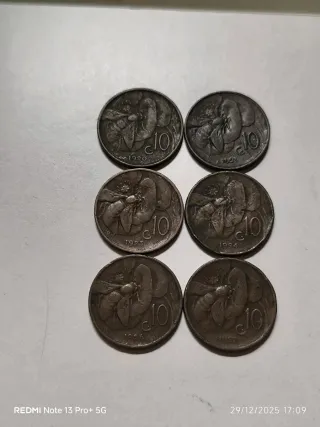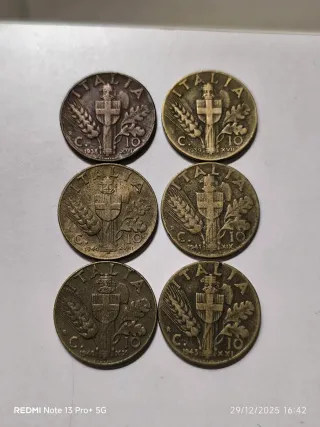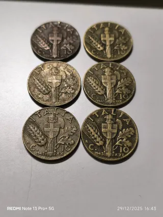 Lotto composto da 6 monete italiane. - Monete coniate durante il regno di Vittorio Emanuele III. - Anni presenti: 1938, 1939, 1940, 1941, 1943. - Valore nominale: 10 centesimi.