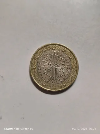 Moneta da 1 Euro della Francia, coniata nel 1999. - Dritto: Albero stilizzato con le lettere RF (République Française). - Rovescio: Mappa dell'Europa. - Anno di coniazione: 1999.