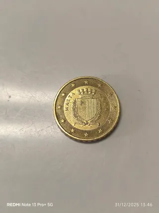 Moneta da 10 centesimi di euro coniata a Malta nel 2008. - Dritto: Stemma di Malta con corona muraria. - Rovescio: Valore nominale e mappa dell'Europa.