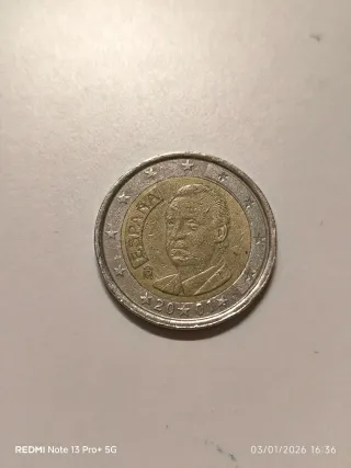 Moneta da 2 euro della Spagna, coniata nell'anno 2000. - Dritto: Ritratto del Re Juan Carlos I. - Rovescio: Mappa dell'Unione Europea.