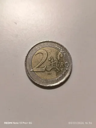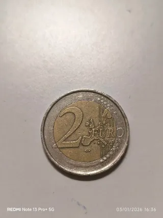 Moneta da 2 Euro del Portogallo, anno 2002, con svariati errori di decentramento delle stelle che dello stemma centrale - Dritto: raffigura il primo stemma reale portoghese. - Rovescio: disegno comune delle monete da 2 Euro. - Anno di conio: 2002.