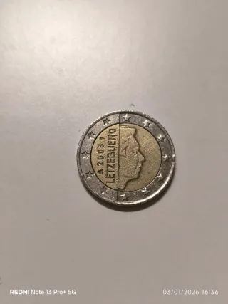 Moneta da 2 Euro del Lussemburgo, anno 2003. - Dritto: Ritratto del Granduca Henri. - Rovescio: Valore nominale e mappa dell'Unione Europea.