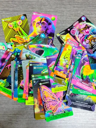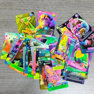 Collezione di carte Cucciolotti Superanimali. - Carte con illustrazioni colorate di animali. - Alcune carte presentano testo in italiano come Mantis, Bear, Parrot, Butterfly, Flame. - Diverse carte mostrano valori come Forza e Energia.