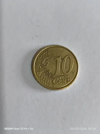 Moneta da 5 centesimi di Euro, coniata in Francia nell'anno 2010. - Dritto: raffigurante Marianne, simbolo della Repubblica Francese. - Rovescio: valore nominale e mappa dell'Europa.
