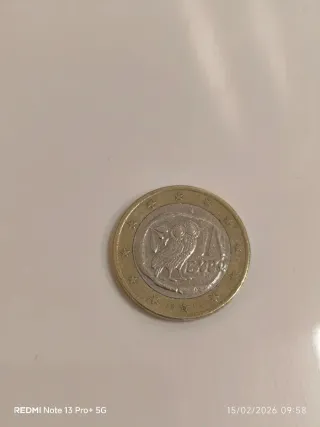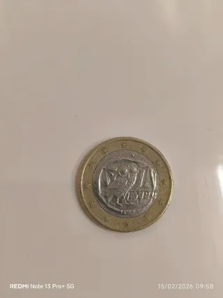 Moneta da 1 Euro della Grecia, coniata nel 2003. - Raffigurante una civetta, simbolo di saggezza. - Design con stelle e il valore nominale.