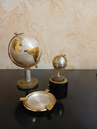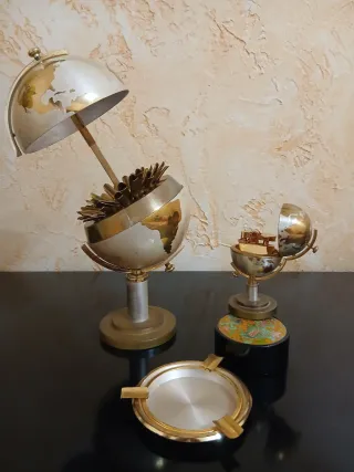 Set da fumatori vintage composto da due globi decorativi e un posacenere. - Globo grande portasigarette con base in ottone e supporto in metallo. - Globo piccolo accendino base decorata e supporto in metallo con carillon. - Posacenere rotondo con bordo e supporti in ottone.