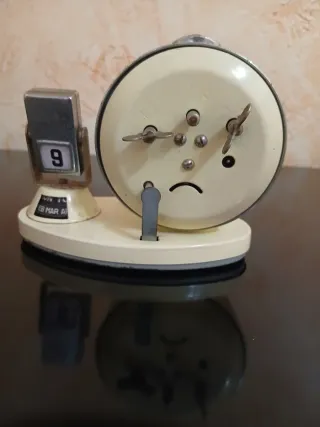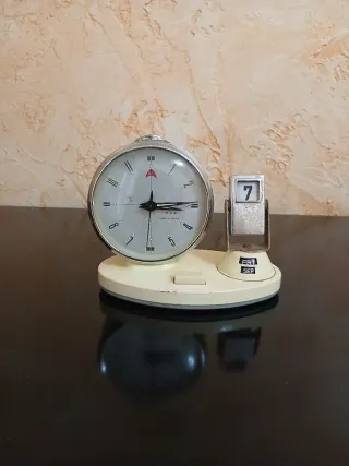Sveglia meccanica da tavolo,in metallo laccato dal design vintage, completa di calendario. Anni 40/50 - condizioni originali, funzionante, manca chiavetta per regolare ora - Quadrante rotondo con numeri arabi. - Indicatore del giorno della settimana e del mese. - Base di appoggio stabile.