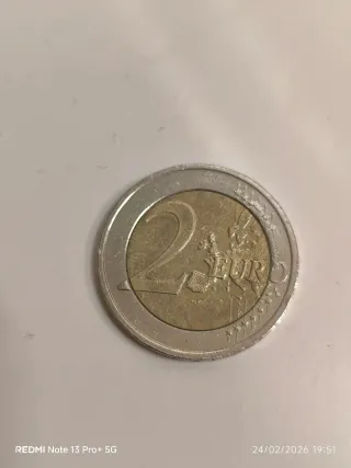 Moneta commemorativa da 2 euro dell'Italia, coniata nel 2025. - Dritto: raffigurante Dante Alighieri, ispirato al Ritratto di Dante di Raffaello. - Rovescio: valore nominale 2 EURO e mappa dell'Europa. - Anno di coniazione: 2025. - Zecca: Roma (R).