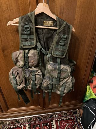 Gilet tattico Arktis CCE Woodland, esercito francese. - Realizzato in robusto tessuto. - Dotato di numerose tasche e scomparti. - Spallacci regolabili. - Include cintura.