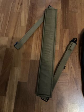 Cinghia per mitragliatrice LMG M240B in colore coyote. Originale americana, in ottime condizioni, spallaccio imbottito e sotto di esso una lastrina di kydex per irrobustire la struttura (eventualmente rimuovibile), due ganci rapidi alle estremità. Pezzo molto particolare, non di facile reperibilità.