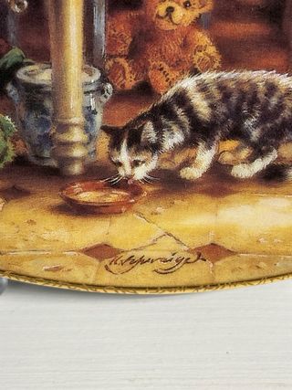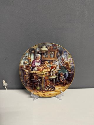 Vendo piatto da collezione in fine porcellana, titolo “Die kleine Küchenfee” (La piccola fata della cucina), prima uscita della collezione “Besuch bei den Großeltern”. Opera dell’artista Harald Schwaiger, realizzata in edizione limitata su porcellana Weimar. Prodotto nel 1993, numerato (Teller Nr. 21977) e marchiato Bradex sul retro (22-W14-2.1). Dimensioni 19x19 cm #bradex #weimarporzellan #piattodacollezione #porcellanavintage #oggettianni90