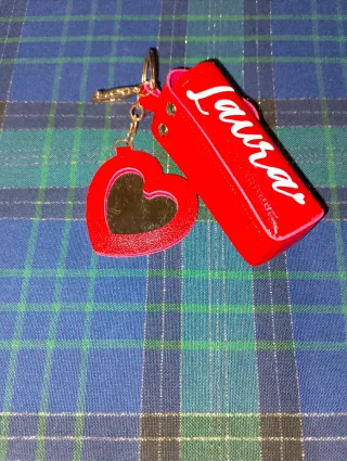 Portachiavi personalizzato con il nome Laura e un ciondolo a forma di cuore con specchio. Porta rossetto 💄 o burro di cacao - Ciondolo a forma di cuore rosso. - Specchio a forma di cuore all'interno del ciondolo. - Nome Laura scritto in bianco sul portachiavi.