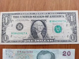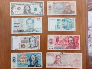 Lotto di banconote estere degli anni '80. - Banconota da 1 dollaro USA con ritratto di George Washington. - Banconota da 20 Baht thailandesi con ritratto di un re. - Banconota da 10 e 5 Kuna croate. - Banconota da 50 e 20 Korun cecoslovacchi. - Banconota da 100 Dracme greche. Etc
