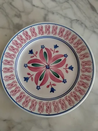 Piatto in ceramica Richard Ginori con decorazioni floreali e bordo a greca. - Motivo floreale centrale con petali rosa e foglie verdi. - Fiori blu e dettagli in rosa sul bordo. - Bordo esterno blu.