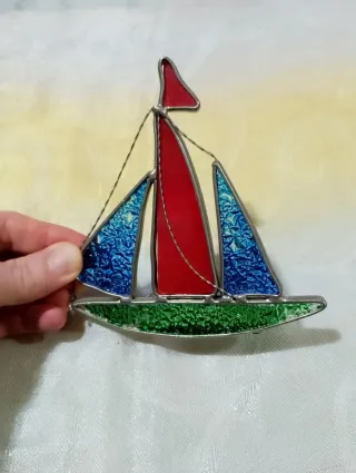 Bellissimo veliero realizzato in vetro colorato, perfetto per decorare. Misure cm 12 x cm 12. - Vetro rosso per la vela principale. - Vetro blu con texture per le vele laterali. - Base verde in vetro. - Bordi in metallo.
