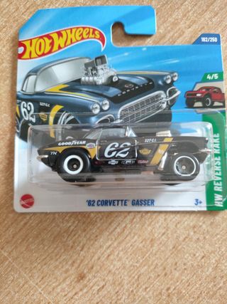Modellino Hot Wheels '62 Corvette Gasser. - Colore nero con dettagli gialli e numero 62. - Design ispirato alle auto da corsa. - Parte della serie HW Reverse Race.
