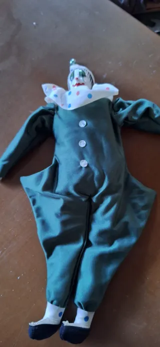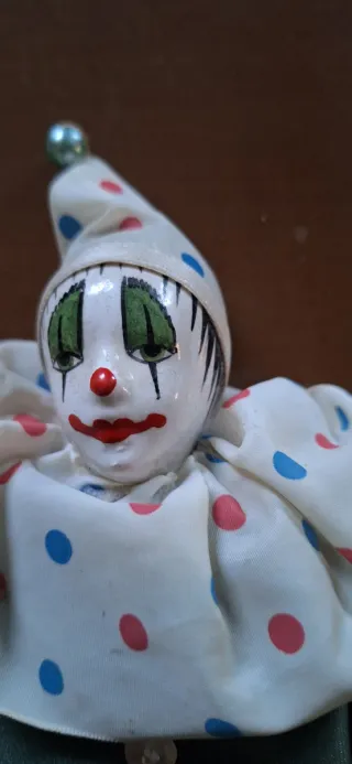 Pierrot clown in ceramica. Un'adorabile figura di clown in ceramica, perfetta per collezionisti o come elemento decorativo. - Dettagli dipinti a mano sul viso. - Indossa un costume verde con pois bianchi e rossi sul colletto.