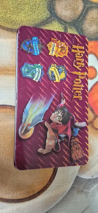 Scatola di latta a tema Harry Potter, con un design ispirato al mondo magico. - Raffigurazioni delle case di Hogwarts. - Immagine di Harry Potter in volo.