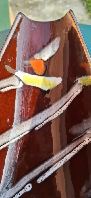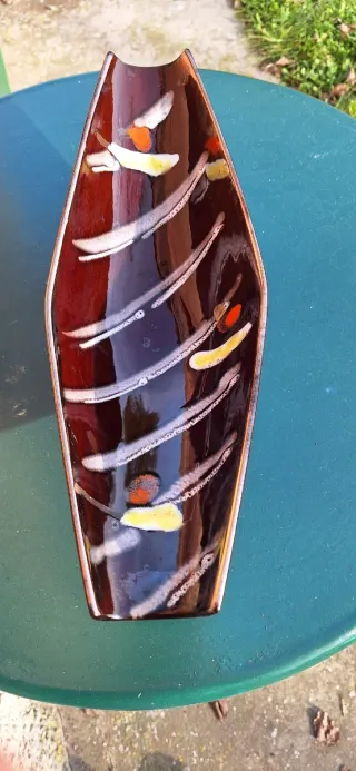 Elegante ciotola in ceramica dal design unico, risalente agli anni '50-'60. - Colore di base marrone scuro lucido. - Decorazioni astratte con striature bianche, gialle e tocchi di arancione. - Forma allungata e affusolata. - Con piedini - Bordo in oro - Senza sbeccatute