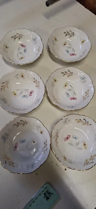 Elegante servizio da macedonia in porcellana bianca, decorato con delicati fiori colorati e bordi dorati. - Sei pezzi. - Design floreale con rametti. - Bordo smerlato con finitura oro.