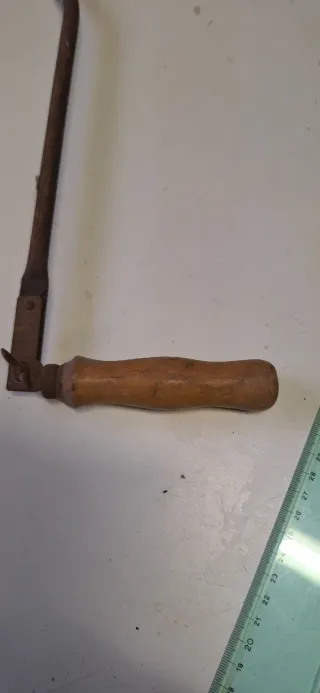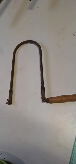 Seghetto ad arco in stile vintage, con manico in legno. - Struttura in metallo. - Manico in legno.