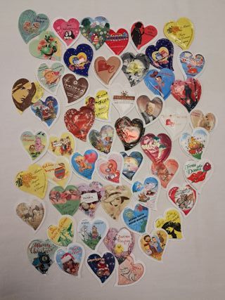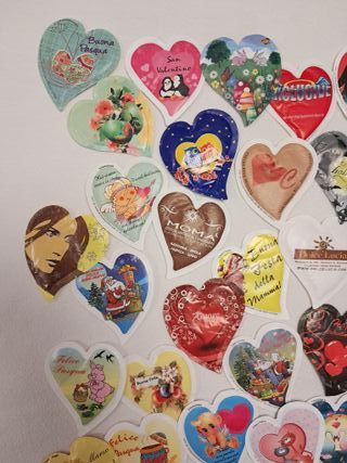 Lotto di oltre 50 bustine zucchero da collezione integre a forma di cuore, temi vari Natale festa della donna San Valentino ecc alcune doppie.