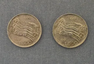 Coppia di monete da 500 Lire in argento, coniate nel 1961 e commemorative del 1861. Materiale: Argento Anno di conio: 1961 Commemorazione: 1861 Valore nominale: 500 Lire