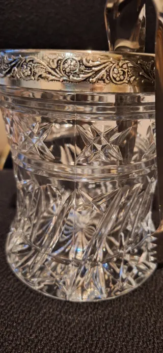 Elegante secchiello portaghiaccio in cristallo, perfetto per aggiungere un tocco vintage alla tua tavola. - Realizzato in cristallo finemente lavorato. - Bordatura decorata in metallo. - Include pinze per ghiaccio abbinate.