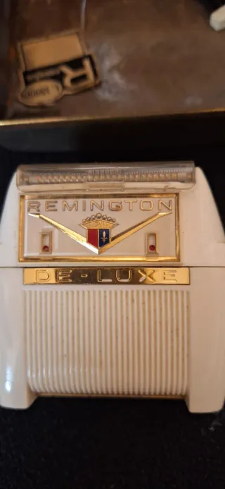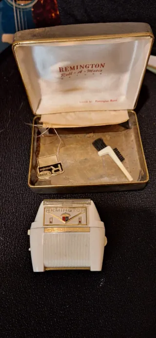 Rasoio elettrico Remington Roll-A-Matic vintage, completo di custodia e accessori. - Custodia originale con logo Remington - Rasoio elettrico bianco e oro. - Spazzolino per la pulizia. - Vedi foto per condizioni.