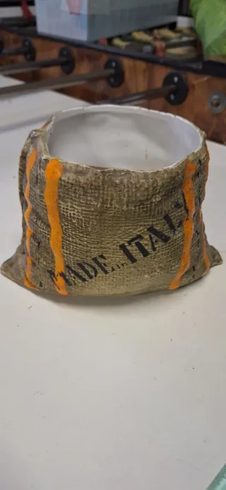 Vaso decorativo in ceramica con finitura che imita una sacca. - Design Made in Italy. - Dettagli color arancio. - Finitura materica che ricorda la juta.